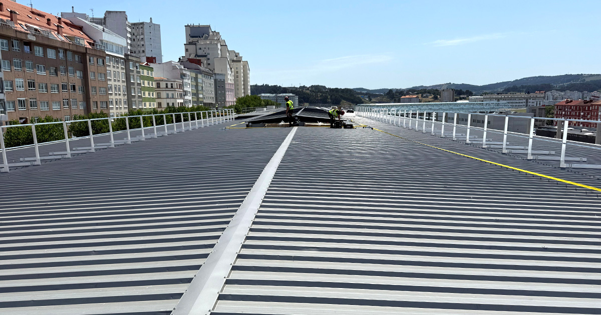 La solución fue la instalación de barandillas perimetrales T22 sobre chapa, una protección pasiva que permite trabajar de forma simultánea a un alto número de operarios, sin limitaciones y con la máxima seguridad.